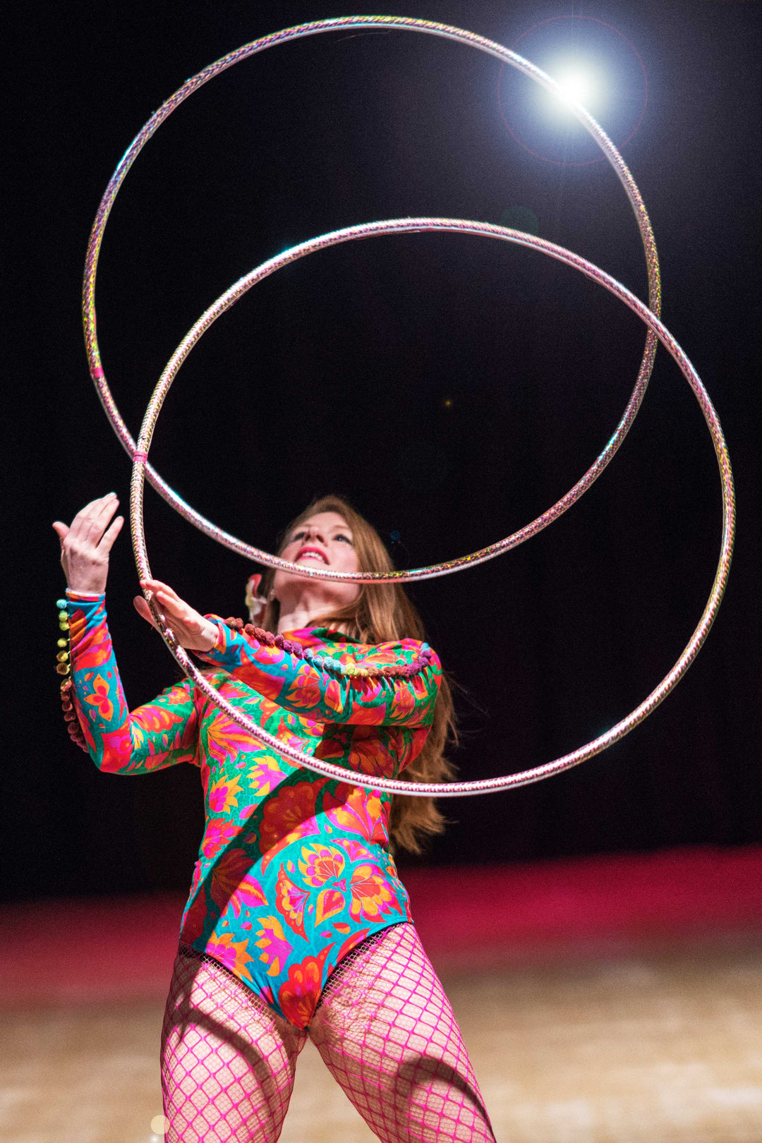 Lila Chupa-Hoops started her hoop journey 10 years ago in Paris, France and it has been more than 7 years that she decided to live the full experience as a hoop artist and teacher. Self taught, she built a diverse repertoire of performances, including emblematic vintage circusy acts that she plays all over Europe. Lila won her first title at the Geneva Burlesque Festival in 2015 with her rockabilly hoop tease, mixing her circus skills to the traditional pin-up strip. Burlesque has been the starting point of her career so of course you can see this style quite predominant in her flow and dance. But that's not all !