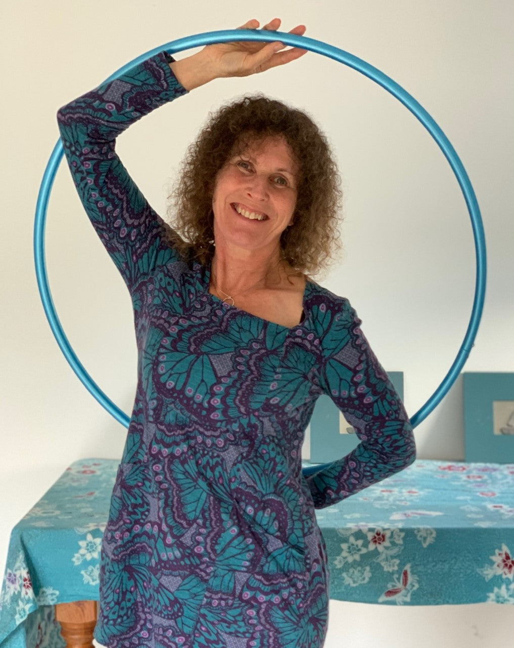 Christine, aka Hulagran. Hooping makes her happy, keeps her fit, gets her dancing every day and is her secret weapon against the effects of ageing! She spent most of her life thinking that waist hooping would be completely impossible for her and could only be done by magically talented athletic people. She was so wrong! She started hooping soon after she became a Granny, and was totally hooked by the way it felt, and by the excitement of learning something new.